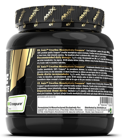 • „Creapure®“ yra grynas kreatino monohidratas, kurį gamina „AlzChem Trostberg GmbH“ kompanija, Vokietijoje. Tai yra plačiausiai tirta kreatino forma ir įrodyta, kad ji yra saugi ir efektyvi. Pirkdami „Creapure®“ papildus, galite būti tikri, kad naudojate vieną geriausių ir patikimiausių produktų rinkoje. Šis kreatinas yra veganiškas ir gaminamas tik cheminės sintezės būdu. Žaliavos ir tarpiniai produktai yra tik aukščiausios klasės, nėra gaunami iš gyvūninių ar augalinių produktų.