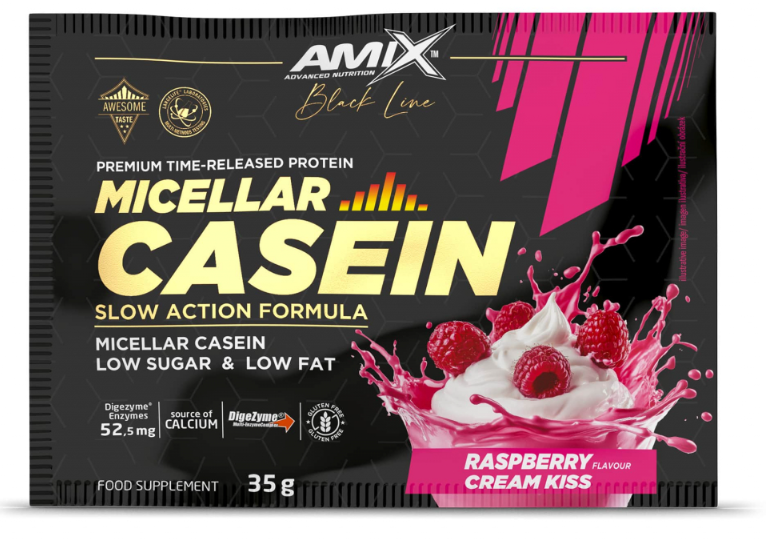 Amix Black Line Micellar Casein – tai aukštos kokybės micelinis kazeinas –  lėtai virškinamo baltymo rūšis, turinti visą spektrą nepakeičiamųjų aminorūgščių. Jį idealiai tinka vartoti ilgesniais intervalais tarp valgymų, pavyzdžiui, vakare prieš miegą. Amix Black Line Micellar Casein kazeinas yra apdorojamas ultrafiltracijos ir švelnaus purškiamojo džiovinimo būdu – ši technologija lemia išskirtinai švelnią tekstūrą ir malonų pojūtį burnoje. Taipogi, sudėtyje yra panaudotas virškinimo fermentų kompleksas DigeZyme®.