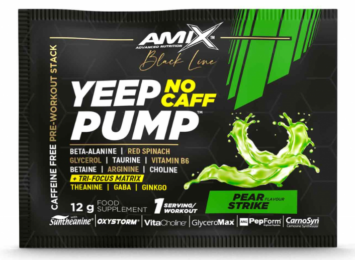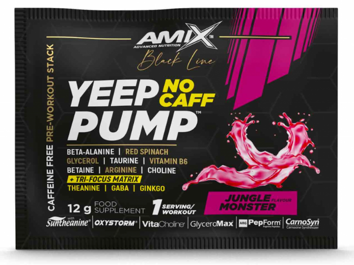 Amix Black Line Yeep Pump No Caff – tai yra prieštreniruotinis maisto papildas, kurio sudėtyje nėra kofeino! Itin daug veikliųjų medžiagų skirtų azoto oksido skatinimui (raumenų užpompavimui), bei specialus mišinys padedantis išlaikyti budrumą bei dėmesį. Tokio tipo prieštreniruotinį produktą galite vartoti nuolatos ir prieš kiekvieną treniruotę, su juo negausite nepageidaujamų efektų, kuriuos dažniausiai suteikia kofeinas.