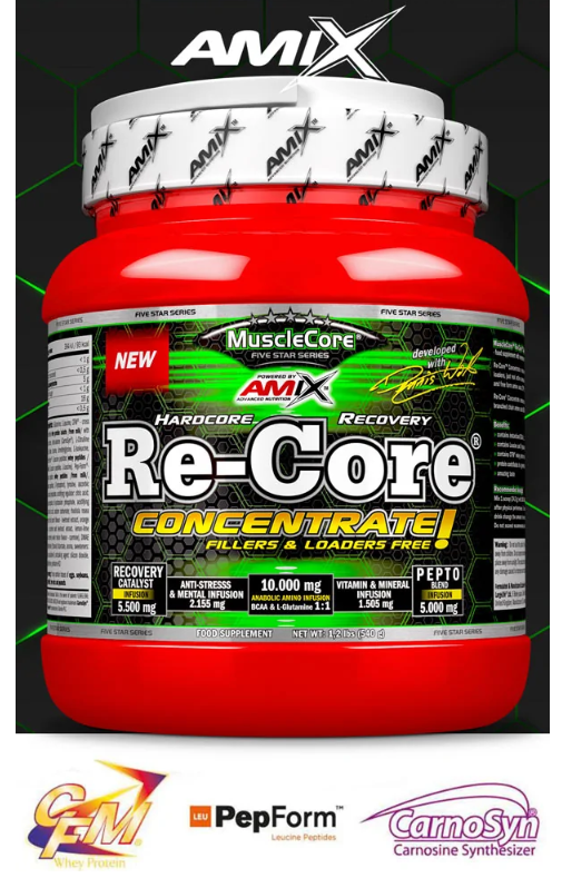 Amix MuscleCore DW - Re-Core Concentrate – tai idealus papildas po treniruotės, kuris visapusiškai palaiko regeneracijos procesus ir apsaugo raumenų masę nuo katabolizmo. Jo stiprybė slypi unikalioje formulėje, kurioje derinami: peptidai PepForm® ir laisvosios aminorūgštys, augaliniai ekstraktai su adaptogeninėmis savybėmis bei CFM® išrūgų baltymų izoliatas, pasižymintis puikiu virškinamumu. Amix MuscleCore DW - Re-Core Concentrate sudėtyje taip pat yra supermikronizuotų šakotosios grandinės aminorūgščių (BCAA) santykiu 8:1:1, kurios suteikia nepakeičiamojo L-leucino, kad patenkintų raumenų poreikius po intensyvių treniruočių. Negana to, šis papildas taip pat praturtintas beta-alaninu, vitaminais ir mineralais, kurie palaiko elektrolitų pusiausvyrą ir spartina regeneraciją.