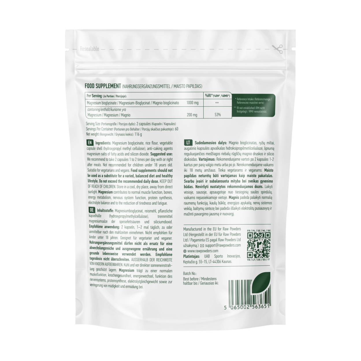 | Raw Powders Magnesium Bisglycinate – dietary supplement in capsules | ||