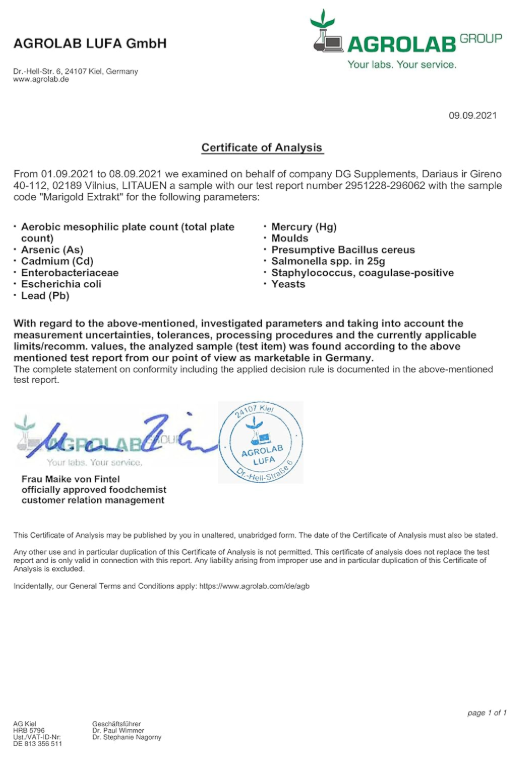 | Medetkų (Marigold) ekstraktas iš kurio liuteinas iš kurio mezo-zeaksantinas iš kurio zeaksantinas | 300 mg. 30 mg. 9 mg. 6 mg. | |