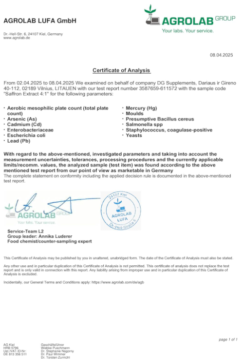 - ❓Tai šafrano (Crocus sativus) kuokelių ekstraktas, tradiciškai naudojamas maisto papilduose. Šafranas yra Viduržemio jūros ir Artimųjų Rytų regionų augalas, vertinamas dėl savo natūralių augalinių junginių, tokių kaip krocinai, safranalis ir picrocrocinas.
