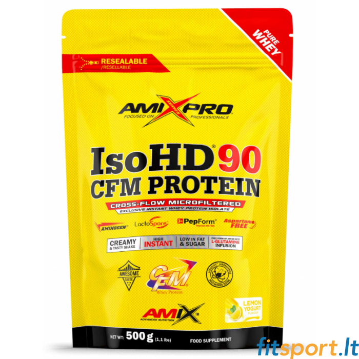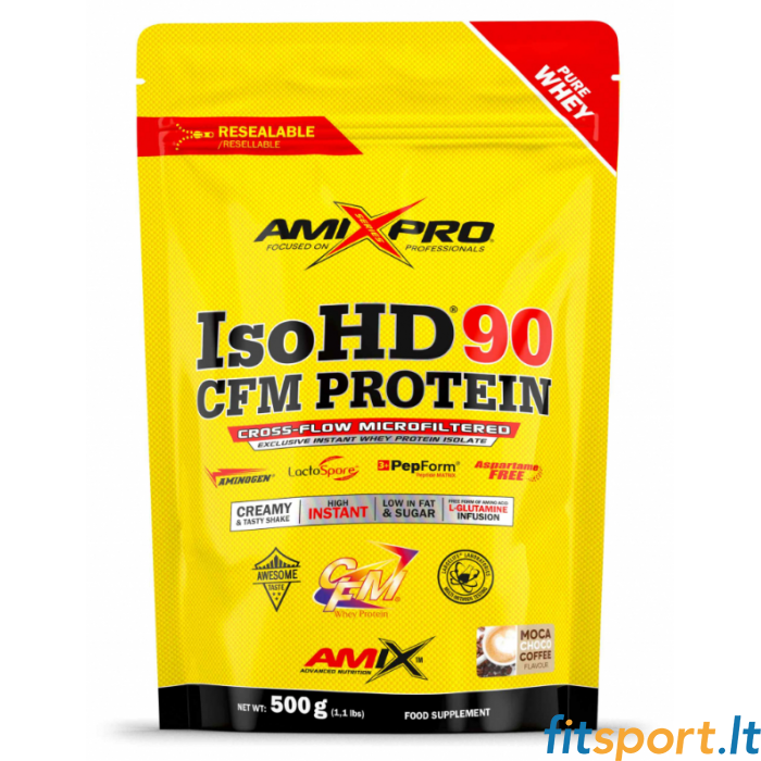 AmixPro® IsoHD 90 CFM Protein – tai aukštos kokybės greito pasisavinimo baltymų izoliatas. Panaudota itin kokybiška žaliava ir specialus išgavimo būdas – CFM® (kryžminio srauto mikrofiltracija), siekiant atitikti net pačių išrankiausių atletų poreikius. AmixPro® IsoHD 90 CFM Protein pasižymi tuom, kad jame beveik nėra riebalų ir angliavandenių, bei yra didelis kiekis šakotų grandinių amino rūgščių (BCAA) ir aminorūgšties L-glutamino. Negana to, šis baltymų mišinys savo sudėtyje turi ir PepForm® Triple-Matrix mišinį bei AminoGen® fermentų ir LactoSpore™ probiotikų mišinius. Suteikite savo raumenims tik geriausią, su AmixPro® IsoHD 90 CFM Protein!
