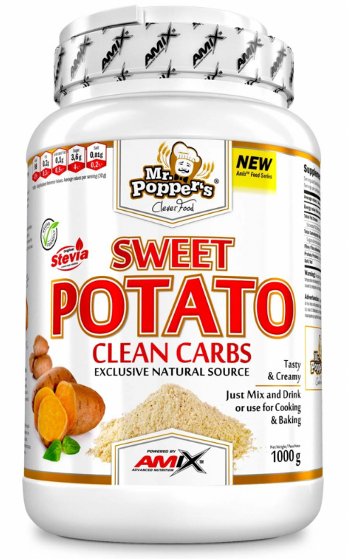 Amix Mr. Poppers - Sweet Potato Clean Carbs – tai specialus mišinys šaltam gėrimui ruošti, pagamintas iš saldžiųjų bulvių miltelių, kuriuose gausu sudėtinių angliavandenių, maistinių skaidulų ir vidutinio kiekio kitų mikroelementų.