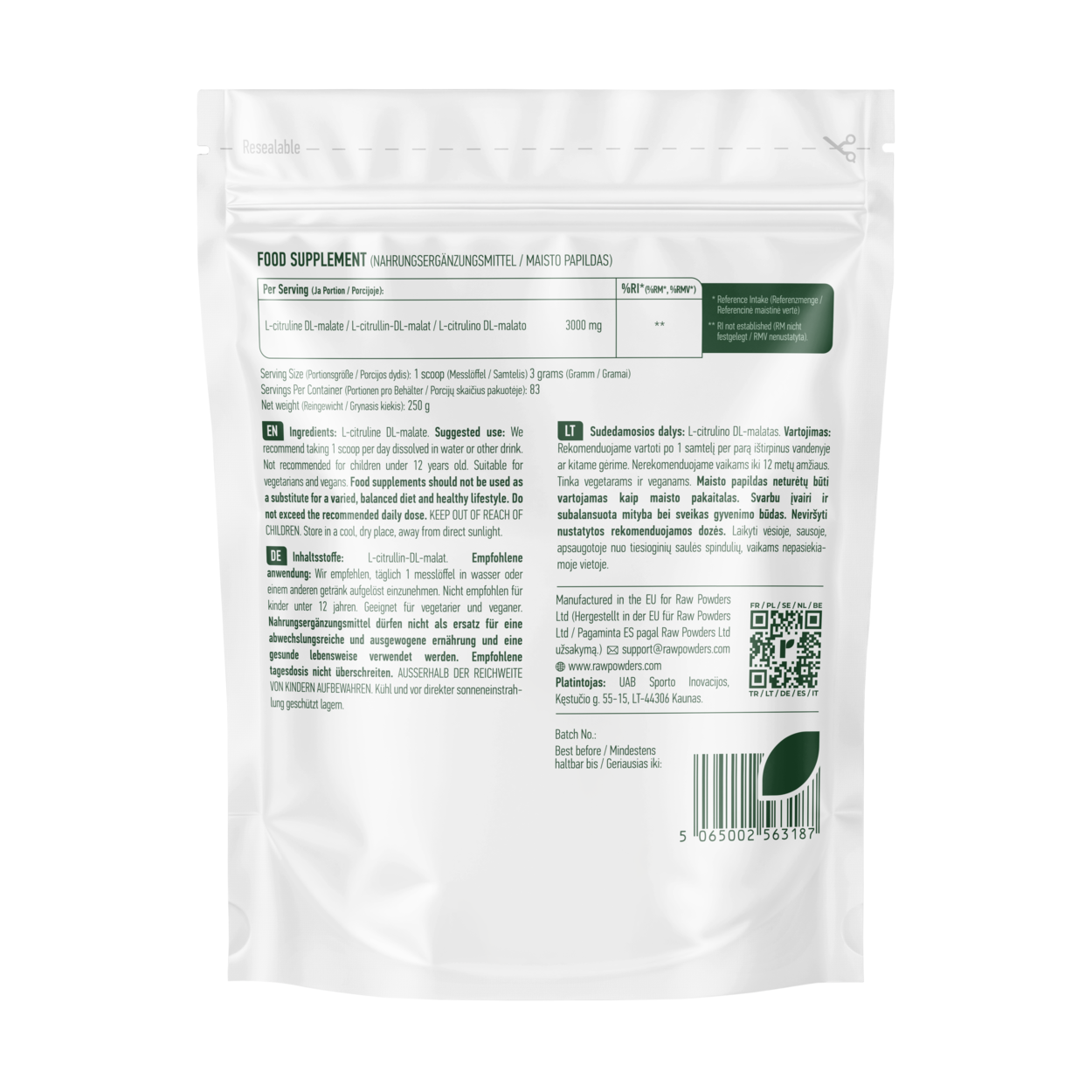 Pagaminta Europos sąjungoje pagal Raw Powders Ltd. užsakymą.