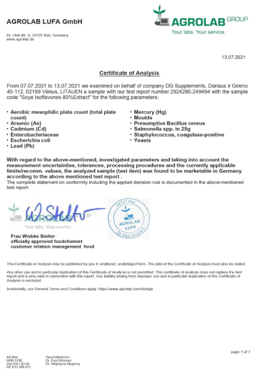 - ❓Tai yra sojos izoflavonų (Soya Isoflavones) ekstraktas, dažnai naudojamas maisto papilduose dėl savo natūralaus augalinio fitoestrogeninio poveikio. Soja (Glycine max) yra augalas, plačiai auginamas Azijoje ir kitose pasaulio dalyse, vertinamas dėl savo baltymų, izoflavonų ir kitų bioaktyvių junginių. Sojos izoflavonus dažnai siejama su hormonų balansavimu, ypač moterims menopauzės laikotarpiu.